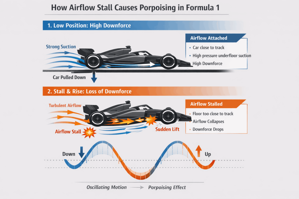 From an aerodynamic perspective, porpoising occurs when airflow under the car repeatedly stalls and reattaches. Each time downforce is lost, the car rises; when downforce returns, the car is pulled back down. This creates a continuous bouncing cycle that can happen many times per second.